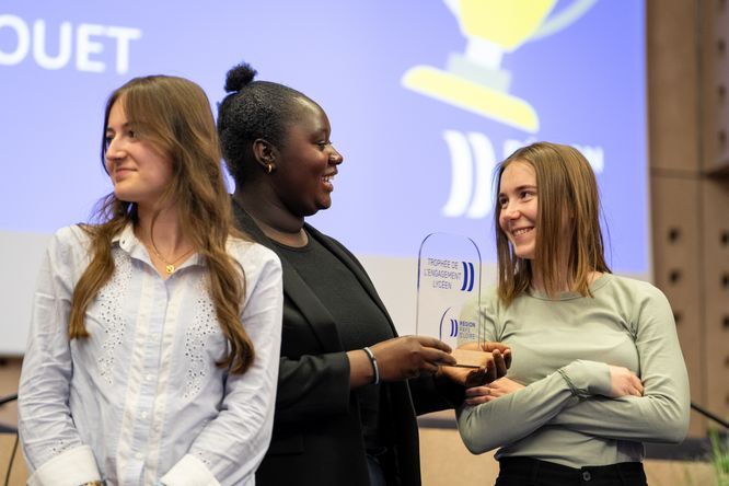 En mai dernier, à l’Hôtel de Région, Béatrice Annereau, conseillère régionale spéciale au handicap, Sandra Impériale, vice-présidente, déléguée à la Jeunesse et Fabien Héraud, acteur, militant et référent sensibilisation au handicap, ont remis 6 Trophées valorisant des projets lycéens sur la thématique « Jumelages et Handicap ». Cette deuxième édition des Trophées de l’engagement lycéen, a réuni dans l’hémicycle 120 lycéens représentants les 486 jeunes ayant contribués aux projets. En groupe, ils ont présenté leurs projets sous la forme d’un pitch de 4 minutes et d’un support visuel réalisé par leurs soins (diaporama, film…). Fabien Héraud, grand témoin, a accompagné les lycéens tout au long de l’après-midi. 6 trophées ont été décernés pour récompenser les 3 projets coup de cœur des jeunes (1 trophée pour l’établissement scolaire et 1 trophée pour l’établissement scolaire spécialisé qui a travaillé sur le même projet).